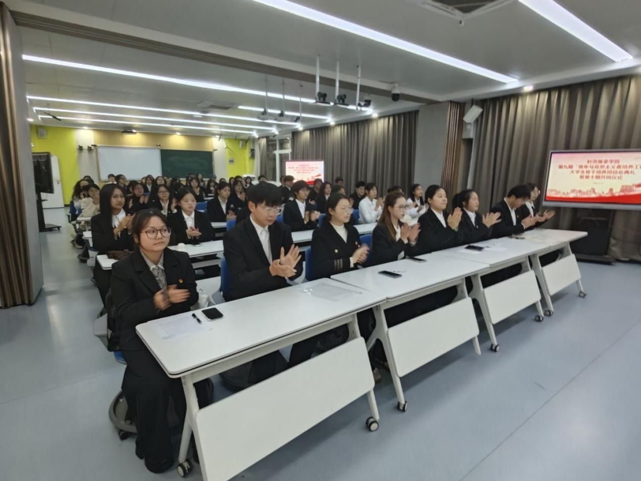 仪式在全体人员齐唱国歌的庄严肃穆氛围中拉开帷幕。会上,第九期“大骨班”优秀学员代表率先发言,结合自身学习经历,分享了在理论学习、实践锻炼中的成长感悟与收获体会,真挚的分享引发在场学员的强烈共鸣。随后,学院团委负责老师围绕第十期“大骨班”的培养体系、目标与发展规划展开系统讲解,既肯定了往期培养工作的成效,也勉励全体学员要坚定理想信念、锤炼过硬本领,以青年骨干的担当践行初心使命。学院学生工作负责人在总结讲话中,对第九期“大骨班”学员在学习期间的优异表现与突出成果给予高度评价,同时对第十期新学员提出三点期望:一是要筑牢思想根基,做政治坚定的“排头兵”;二是要勤学善思笃行,做能力过硬的“实干家”;三是要发挥表率作用,做服务同学的“贴心人”。讲话结束后,现场举行了第九期“大骨班”结业证书颁发仪式,学生工作负责人为优秀学员颁发证书,台下掌声阵阵,将仪式氛围推向高潮。