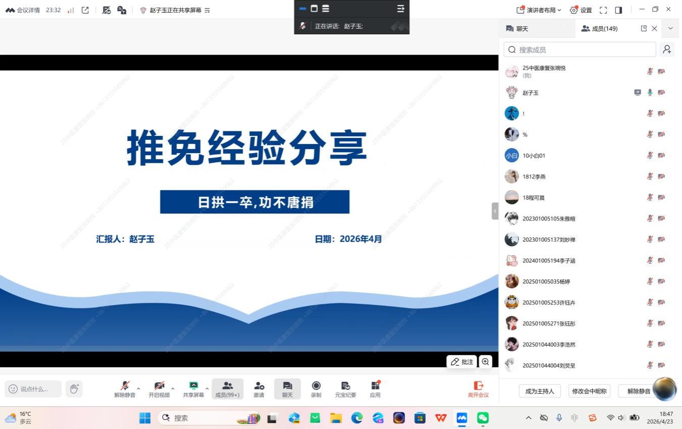 江中新闻网讯(通讯员 李静 张琬悦 陈筱昕)为扎实推进学风建设,落实立德树人根本任务,搭建优秀学子交流平台,帮助低年级同学明晰推免政策、掌握备考技巧、明确升学方向,切实解决推免资格获取等实际问题,针灸推拿学院素质拓展部于4月23日晚举办推免经验线上分享会。本次活动是学院加强学风建设、发挥榜样引领作用的重要举措之一。