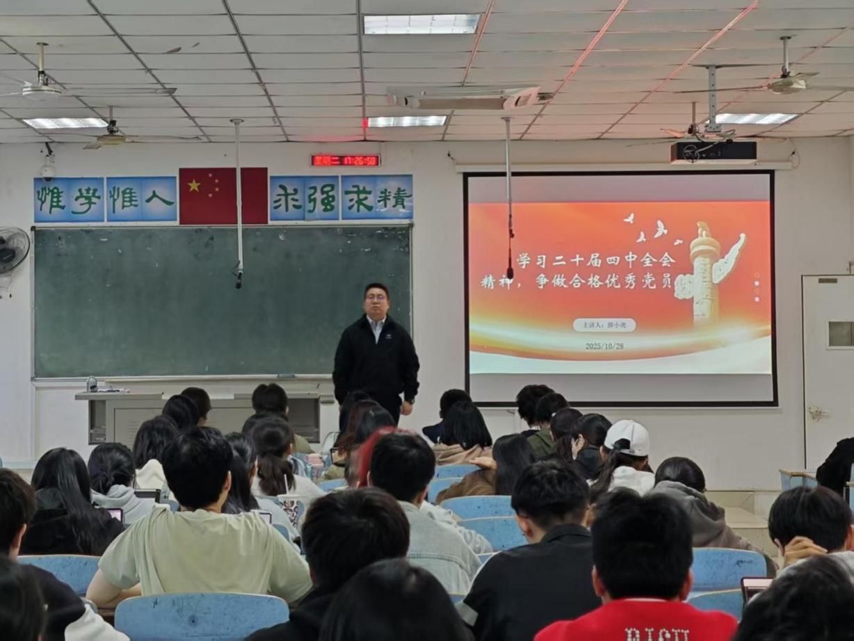 授课中,学院学生工作负责人从党的二十届四中全会召开的时代背景、核心要义及实践要求等方面展开解读,结合高校人才培养目标与学生成长实际,剖析了全会精神对青年党员的指导意义。最后,他对所有学员提出三点要求:一是筑牢思想根基,持续深化理论学习,把对全会精神的理解转化为坚定的理想信念;二是强化实践担当,在学业科研、志愿服务等场景中发挥先锋模范作用,以实干提升专业本领;三是严守纪律规矩,以共产党员标准严格要求自我,主动接受组织和群众监督。