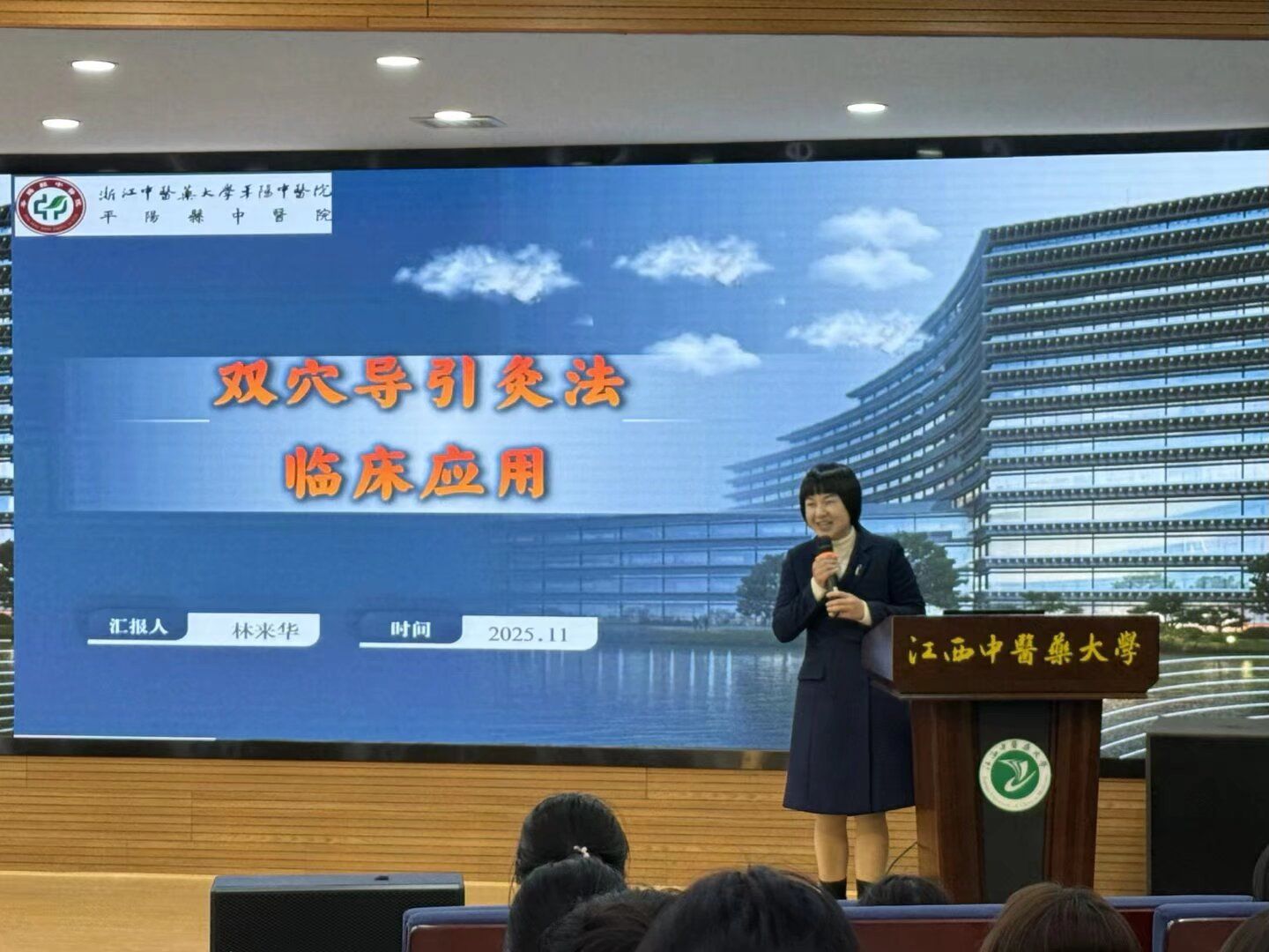 江中新闻网讯(通讯员 葛荣荣 陈诗语)为助力青年学子夯实专业基础,提升临床实操能力,11月18日,由江西中医药大学教务处主办、针灸推拿学院承办的第八十九期《中医大讲堂》在图书馆二楼学术报告厅举行。本次讲座特邀浙江省平阳县中医院公共卫生管理中心主任林来华担任主讲嘉宾,围绕“双穴导引灸法的创新与临床应用”主题,为师生带来一场兼具理论深度与实操价值的学术分享。